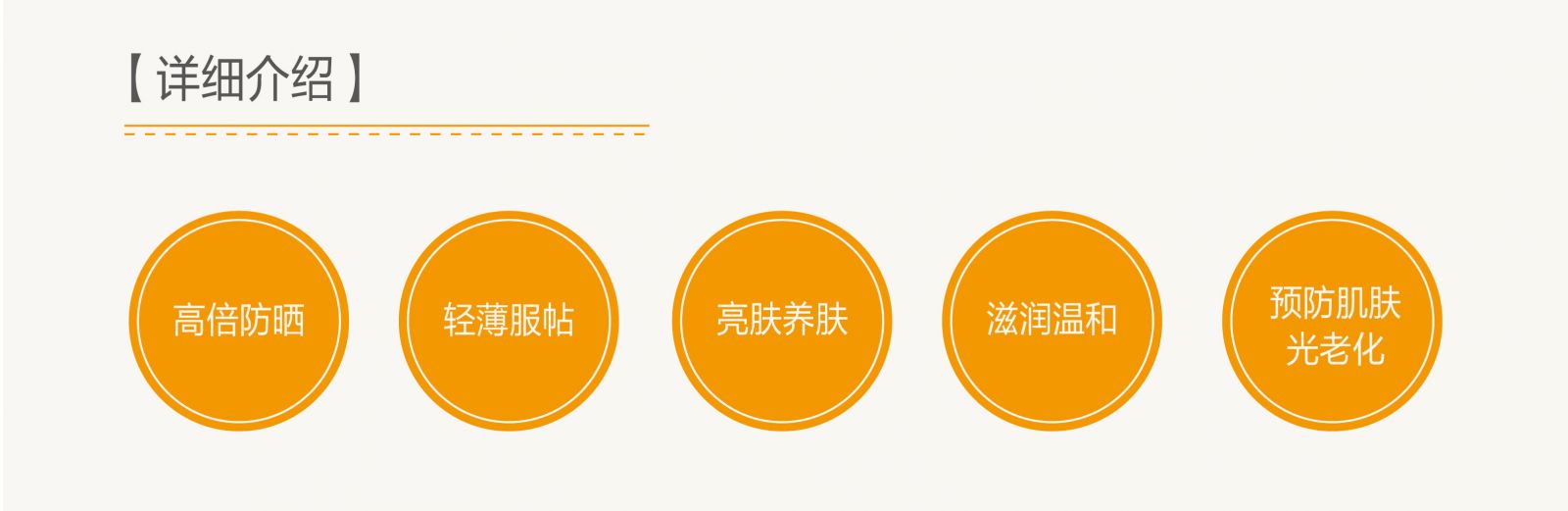 高倍防曬,輕薄服帖,亮膚養(yǎng)膚,滋潤溫和,預(yù)防肌膚光老化