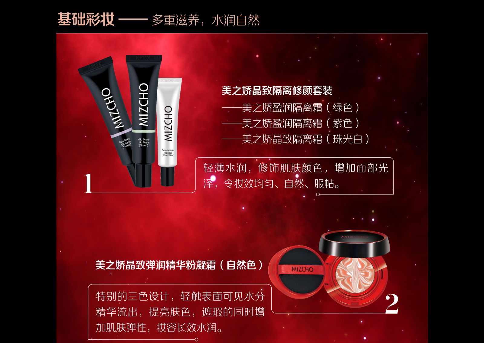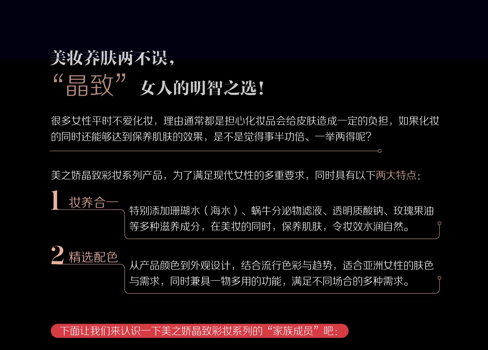 很多女性平時不愛化妝,理由通常都是擔(dān)心化妝品會給皮膚造成一定的負(fù)擔(dān),如果化妝的同時還能夠達(dá)到保養(yǎng)肌膚的效果,是不是覺得事半功倍、一舉兩得呢? 美之嬌晶致彩妝系列產(chǎn)品,為了滿足現(xiàn)代女性的多重要求,同時具有以下兩大特點(diǎn): 1、妝養(yǎng)合一:特別添加珊瑚水(海水)、蝸牛分泌物濾液、透明質(zhì)酸鈉、玫瑰果油等多種滋養(yǎng)成分,在美妝的同時,保養(yǎng)肌膚,令妝效水潤自然。 2、精選配色:從產(chǎn)品顏色到外觀設(shè)計(jì),結(jié)合流行色彩與趨勢,適合亞洲女性的膚色與需求,同時兼具一物多用的功能,滿足不同場合的多種需求。