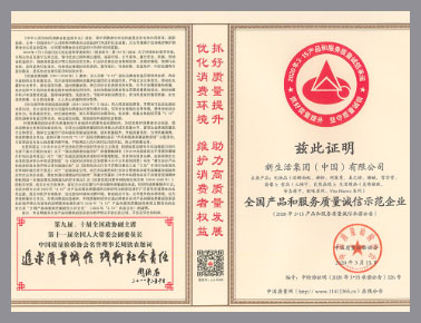 2020年3月15日,在中國(guó)質(zhì)量檢驗(yàn)協(xié)會(huì)主辦的“3·15”產(chǎn)品和服務(wù)質(zhì)量誠(chéng)信承諾主題活動(dòng)中,新生活集團(tuán)(中國(guó))有限公司憑借優(yōu)質(zhì)的產(chǎn)品和的誠(chéng)信的服務(wù)精神,榮獲“全國(guó)產(chǎn)品和服務(wù)質(zhì)量誠(chéng)信示范企業(yè)”稱號(hào)。