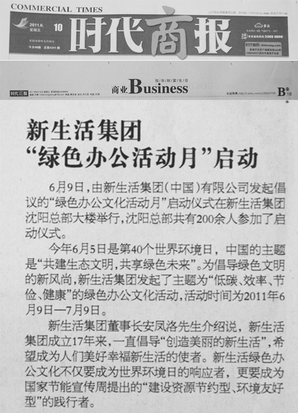 今年6月5日是第40個世界環(huán)境日,中國的主題是“共建生態(tài)文明,共享綠色未來”。為倡導(dǎo)綠色文明的新風(fēng)尚,新生活集團發(fā)起了主題為“低碳、效率、節(jié)儉、健康”的綠色辦公文化活動,活動時間為2011年6月9日—7月9日。