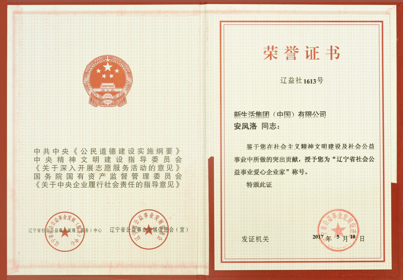 近日,新生活集團(tuán)董事長(zhǎng)安鳳洛被遼寧省社會(huì)公益事業(yè)發(fā)展(服務(wù))中心及遼寧省公益事業(yè)發(fā)展促進(jìn)會(huì)評(píng)為“遼寧省社會(huì)公益事業(yè)愛(ài)心企業(yè)家”榮譽(yù)稱(chēng)號(hào)。