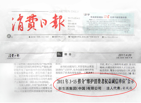 在剛剛過去的2011年3.15 “維護(hù)消費(fèi)者權(quán)益誠信單位”宣傳推介活動中,新生活集團(tuán)獲得“維護(hù)消費(fèi)者權(quán)益誠信單位”的稱號,并獲得由中國消費(fèi)者基金會頒發(fā)的“維護(hù)消費(fèi)者權(quán)益誠信單 位”牌匾和榮譽(yù)證書。該榮譽(yù)將于4月中旬在國家消費(fèi)權(quán)威媒體《消費(fèi)日報》上進(jìn)行宣傳公告。