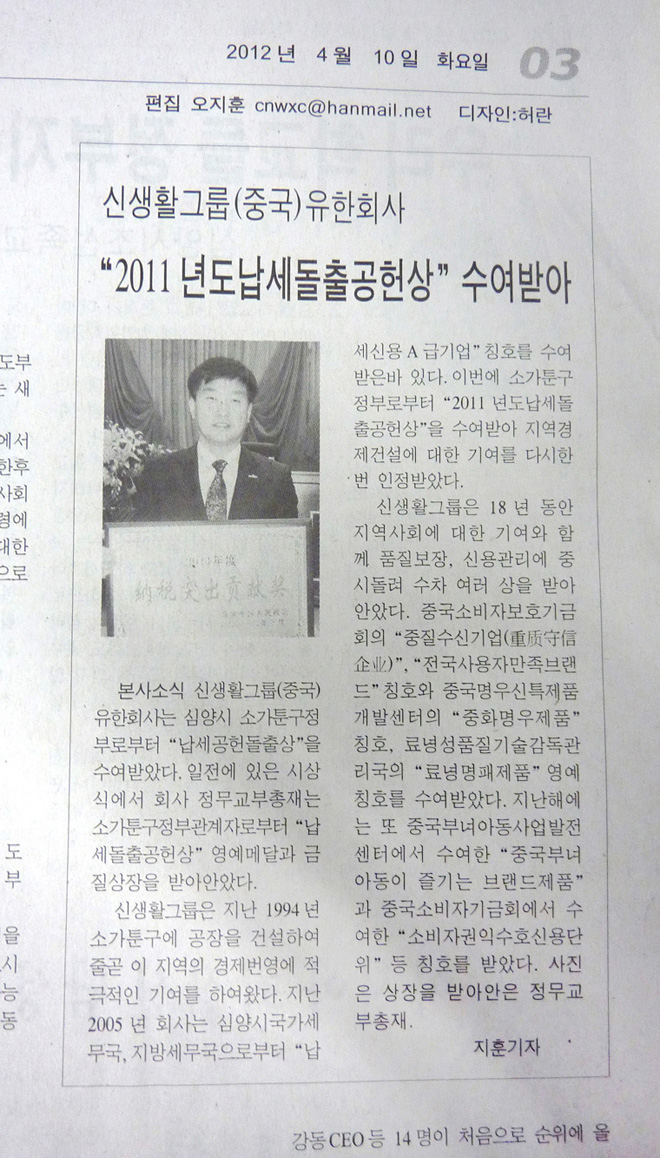[遼寧朝鮮文報(bào)]新生活集團(tuán)榮獲2011年納稅突出貢獻(xiàn)獎(jiǎng)