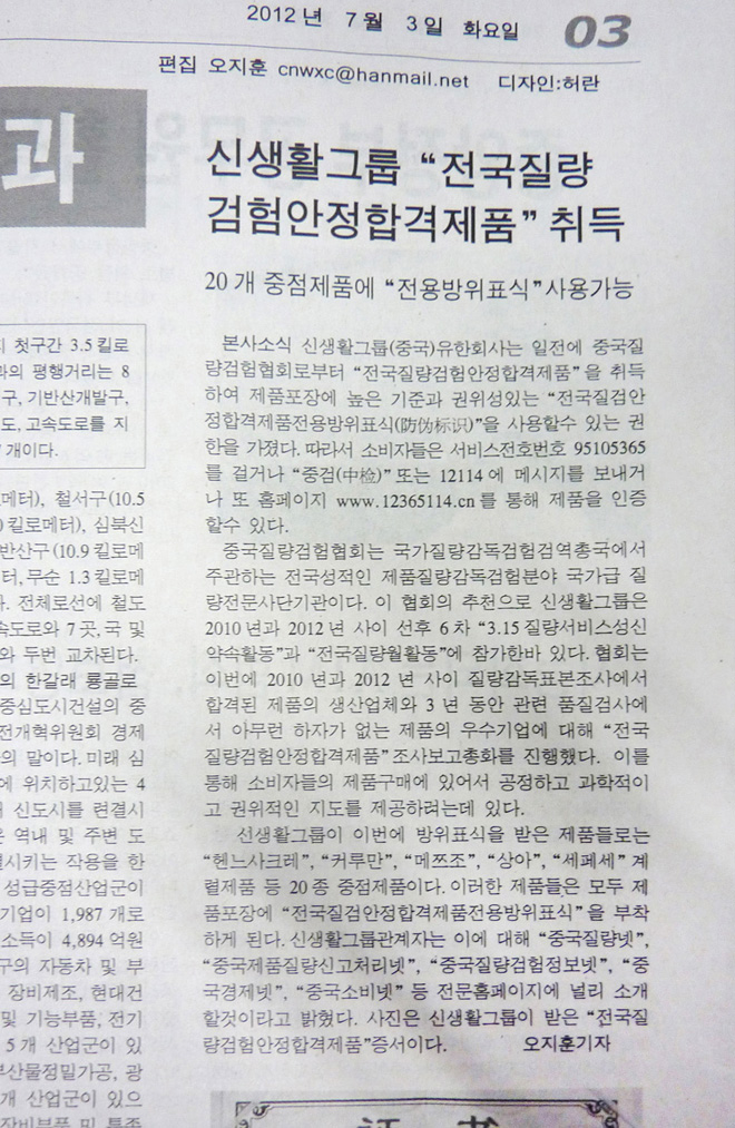 [遼寧朝鮮文報]新生活集團榮獲“全國質(zhì)量檢驗穩(wěn)定合格產(chǎn)品”稱號