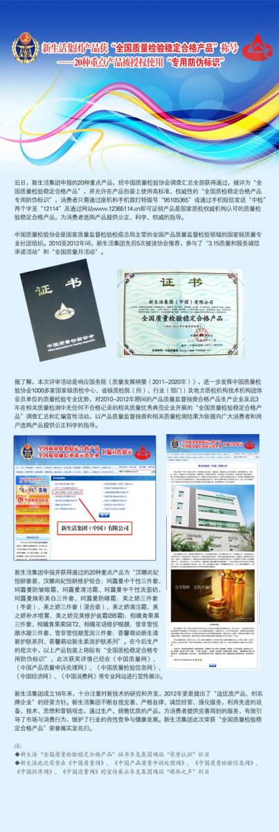 新生活產(chǎn)品獲“全國質(zhì)量檢驗(yàn)穩(wěn)定合格產(chǎn)品”稱號