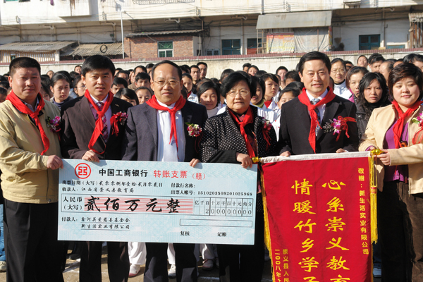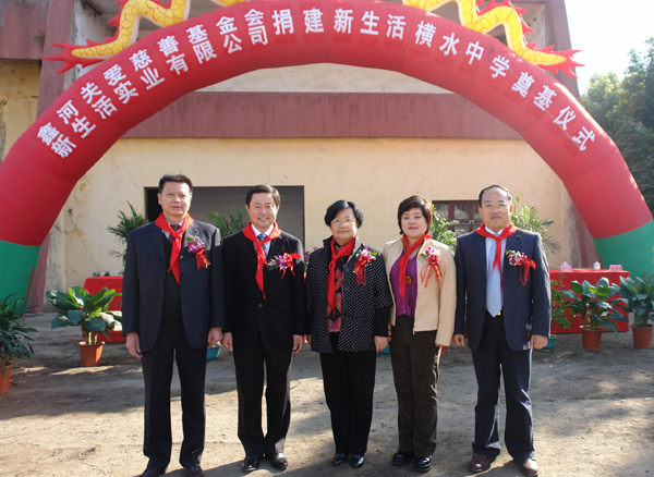 2008年12月2日,新生活實(shí)業(yè)有限公司董事長(zhǎng)安鳳洛先生出席了“新生活橫水中學(xué)捐建奠基儀式”。新生活實(shí)業(yè)有限公司、鑫河關(guān)愛(ài)慈善基金會(huì)與江西省贛州市崇義縣有關(guān)部門簽定協(xié)議,正式向橫水中學(xué)捐贈(zèng)了200萬(wàn)元人民幣,用于橫水中學(xué)綜合樓、學(xué)生公寓的建設(shè)。