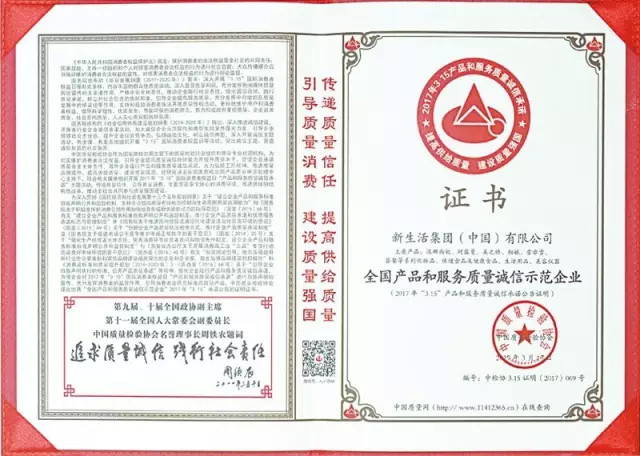 近期,新生活集團在2017年“3.15”國際消費者權益日“產品和服務質量誠信承諾”主題活動中榮獲“全國產品和服務質量誠信示范企業(yè)”榮譽稱號。