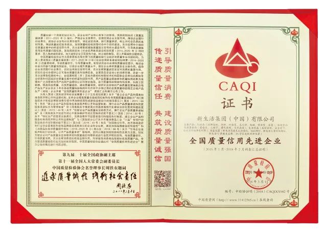 近日,在中國質量檢驗協會主辦的“產品和服務質量誠信承諾”主題活動中,新生活集團(中國)有限公司憑借優(yōu)質的產品品質與服務質量,榮獲“全國產品和服務質量誠信示范企業(yè)”“全國質量信用先進企業(yè)”兩項殊榮。