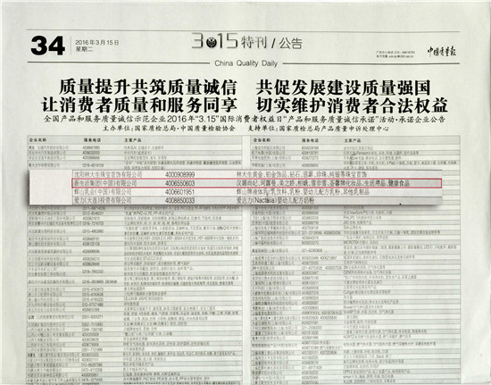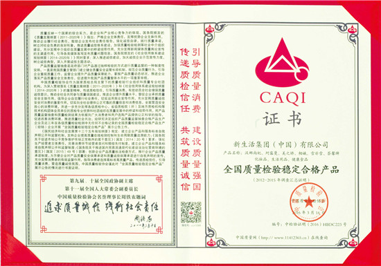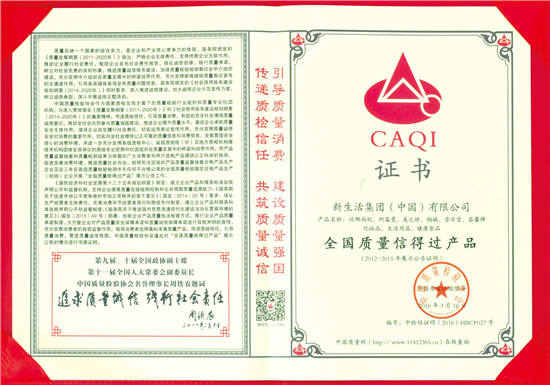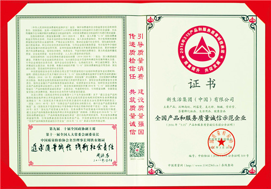 在剛剛結(jié)束的由中國質(zhì)量檢驗(yàn)協(xié)會(huì)主辦的2016年3.15國際消費(fèi)者權(quán)益日“產(chǎn)品和服務(wù)質(zhì)量誠信承諾”主題活動(dòng)中,新生活集團(tuán)被授予“全國產(chǎn)品和服務(wù)質(zhì)量誠信示范企業(yè)”、“全國質(zhì)量檢驗(yàn)穩(wěn)定合格產(chǎn)品”和“全國質(zhì)量信得過產(chǎn)品”三項(xiàng)榮譽(yù)稱號(hào)。每一項(xiàng)榮譽(yù)都是對(duì)新生活集團(tuán)過去生產(chǎn)經(jīng)營和服務(wù)的肯定,也是未來發(fā)展中我們要一直堅(jiān)守的承諾。
