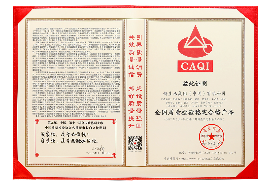 產(chǎn)品質(zhì)量是企業(yè)的立身之本。自成立以來,新生活集團(tuán)始終專注為消費者提供優(yōu)質(zhì)的產(chǎn)品與服務(wù),堅持研發(fā)與創(chuàng)造高標(biāo)準(zhǔn)、高技術(shù)含量的化妝品、健康產(chǎn)品和生活用品,同時在堅守品質(zhì)的基礎(chǔ)上,不斷升級產(chǎn)品與服務(wù),努力滿足消費者的多方面需求。“全國質(zhì)量檢驗穩(wěn)定合格產(chǎn)品”這份榮譽,是對新生活當(dāng)前工作的肯定,也是一份沉甸甸的社會責(zé)任,激勵我們不斷發(fā)展進(jìn)步。