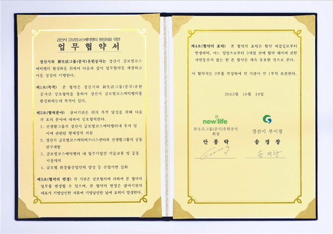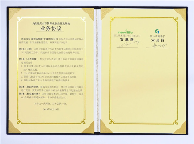 2015年10月19日,新生活集團(tuán)(中國)有限公司與韓國慶山市為促進(jìn)慶山市國際化妝品谷的發(fā)展,簽訂了業(yè)務(wù)協(xié)議。雙方將就慶山市國際化妝品谷的投資、化妝品的研發(fā)、技術(shù)交流及市場開拓與人才的培養(yǎng)等方面進(jìn)行緊密合作。新生活集團(tuán)(中國)有限公司董事長安鳳洛與慶山市相關(guān)政府官員出席了當(dāng)天的簽約儀式。