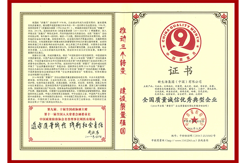 2014年 “企業(yè)質(zhì)量誠(chéng)信倡議”專題活動(dòng)由國(guó)家質(zhì)量監(jiān)督檢驗(yàn)檢疫總局、中共中央宣傳部、教育部、科學(xué)技術(shù)部、工業(yè)和信息化部、公安部、人力資源部和社會(huì)保障部、環(huán)境保護(hù)部、住房和城鄉(xiāng)建設(shè)部、交通運(yùn)輸部、水利部、農(nóng)業(yè)部、商務(wù)部等37個(gè)單位和部門共同主辦。凝聚社會(huì)力量,形成質(zhì)量共治,推動(dòng)“中國(guó)制造向中國(guó)創(chuàng)造改變、中國(guó)速度向中國(guó)質(zhì)量轉(zhuǎn)變、中國(guó)產(chǎn)品向中國(guó)品牌轉(zhuǎn)變”,是2014年“質(zhì)量月”活動(dòng)的基本遵循。在本次“質(zhì)量月”專題活動(dòng)中,新生活集團(tuán)(中國(guó))有限公司獲得了“全國(guó)質(zhì)量誠(chéng)信優(yōu)秀典型企業(yè)”榮譽(yù)稱號(hào)