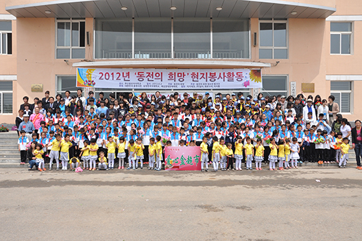“零錢的希望”活動機構志愿者與貧困小學生合影