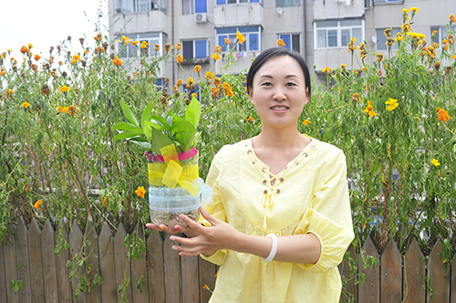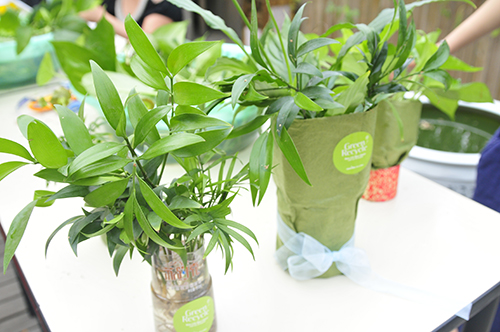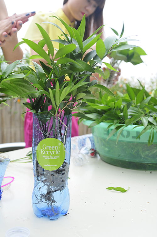 下面是見證奇跡的時刻。工具為空飲料瓶、絲帶、和公司LOGO不粘膠貼。當(dāng)然還有植物。
