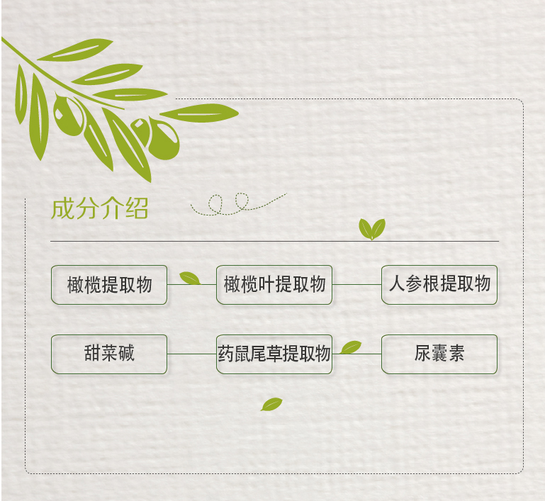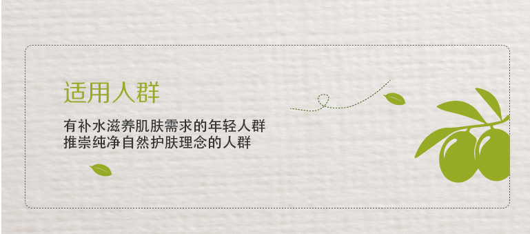 含有橄欖提取物,可補(bǔ)充水分,潤養(yǎng)肌膚。
