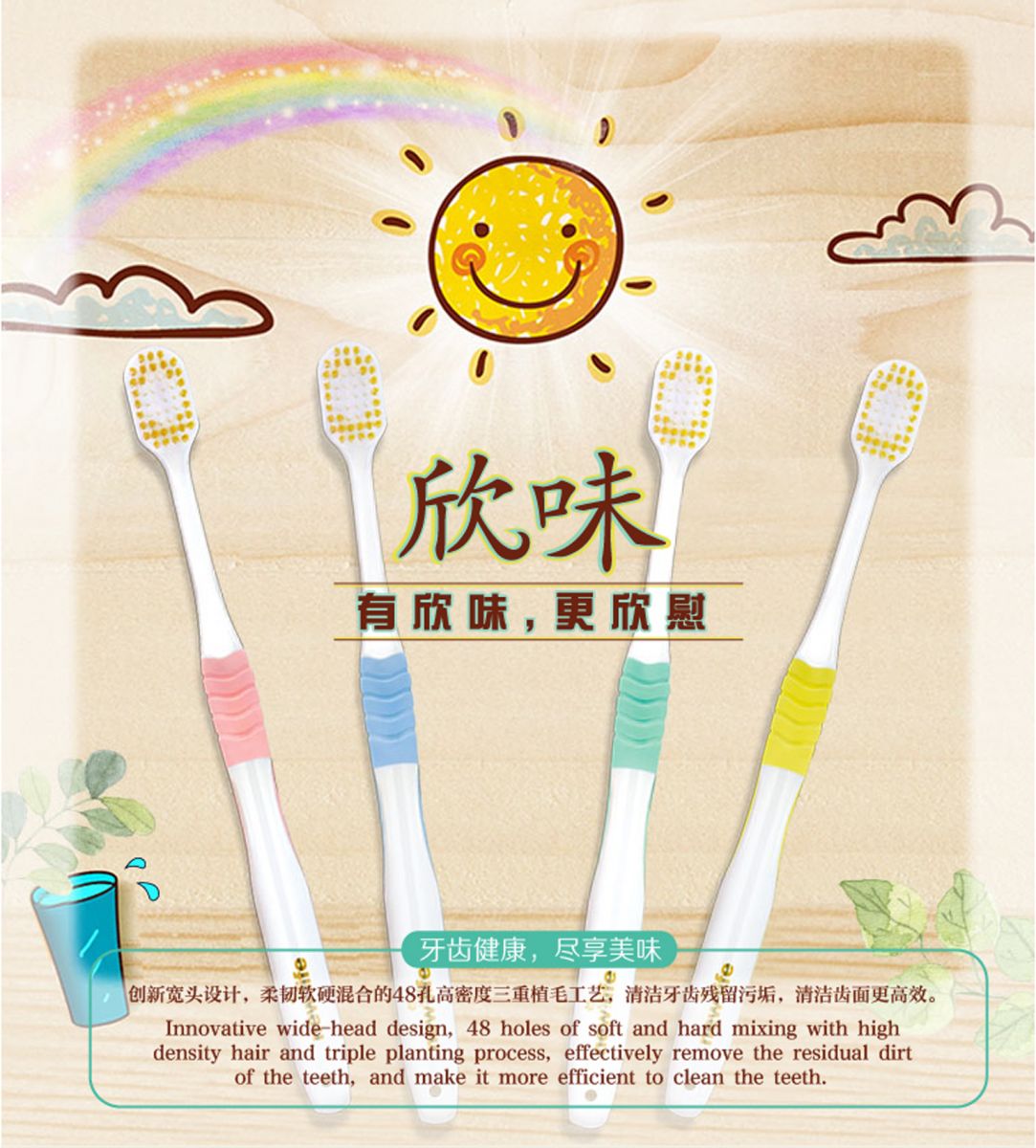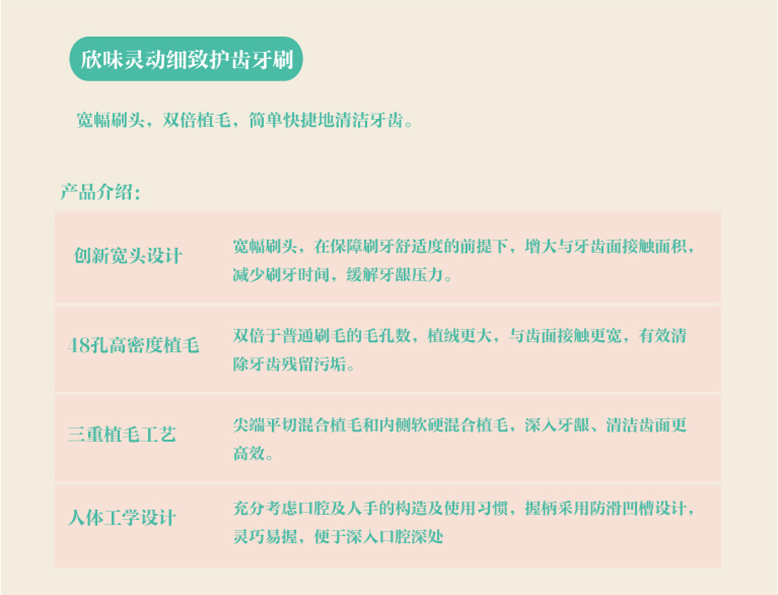 創(chuàng)新寬頭設(shè)計(jì),柔韌軟硬混合的48孔高密度三重植毛工藝,有效清潔牙齒殘留污垢,清潔齒面更高效。